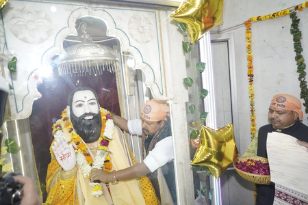 The temple management committee and Delhi BJP leaders welcomed and felicitated Nitin Nabin and presented him with a small memorial statue of Sant Shri Ravi Dass.