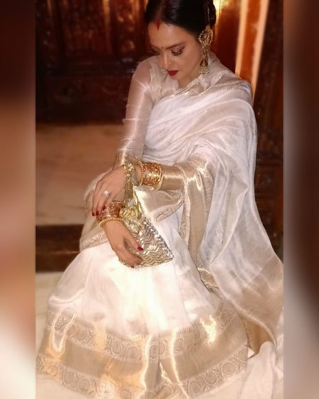 Manish took to his official Instagram handle on Tuesday and dropped a string of stunning photos of Rekha in his ivory Banarasi saree with a matching blouse. Her latest ethnic ensemble was accessorized with a huge pair of earrings, a large set of bangles, along with her classic red lipstick and sindoor.