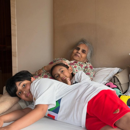 Arpita took to Instagram, where she shared a picture of Salma Khan lying comfortably on a bed, smiling warmly as Ahil and Ayat cuddled close to her.