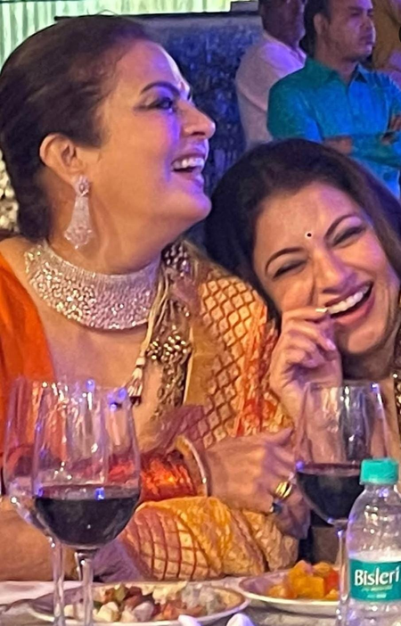 Another picture captures Sheeba and Bhagyashree enjoying a carefree moment in a swimming pool. A third picture features them dressed in elegant traditional attire, sharing a candid laugh at what looks like a celebration party.