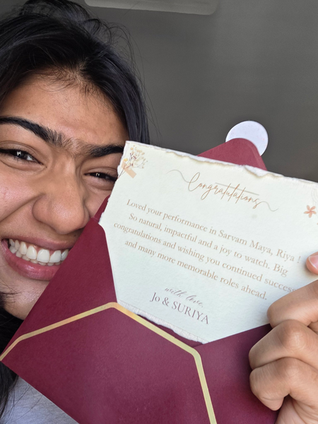 Taking to her social media timelines to share images of the hamper and the congratulatory note, the actress wrote, “Simply over the moon!!!! Thank you so so much @Suriya_offl sir #jyothika maa!! To take the time and effort to send me this hamper as a token of appreciation for my performance really means a lot to me. Accepting this on behalf of the entire team of #SarvamMaya.”