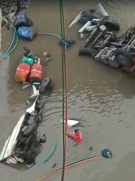 According to initial reports, four vehicles, including two trucks, a Bolero SUV, and a pickup van, were crossing the bridge when it suddenly crumbled.